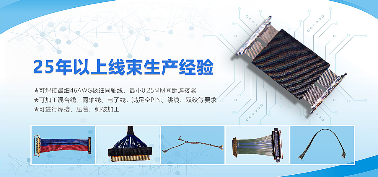 公司主營極細同軸線束、車載信號線束、航空頭線束、RF射頻線、電子接插件、微動開關(guān)等